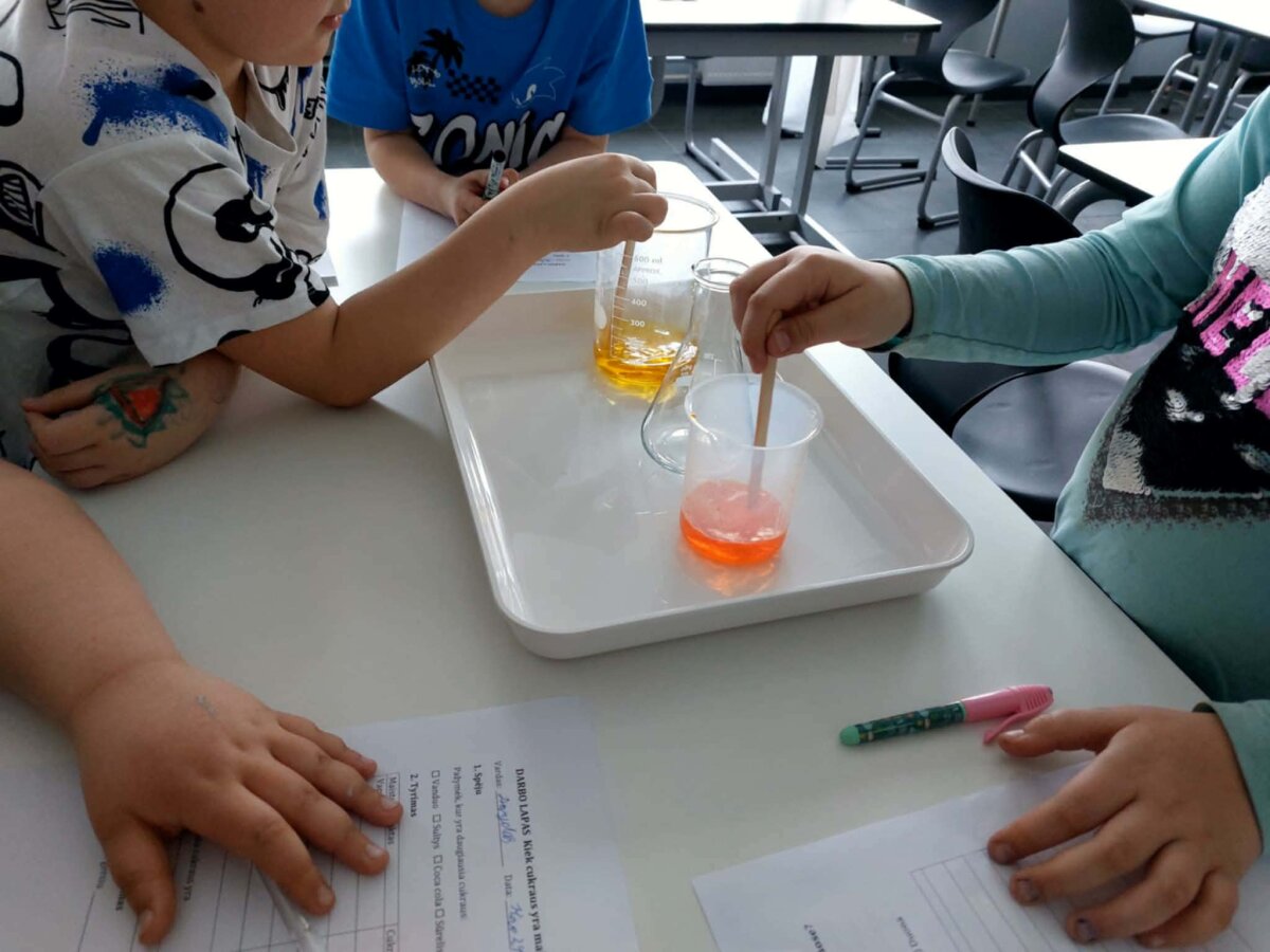Pamokose „Vandens būsenos“ pirmokai atliko bandymus laboratorijoje. Vaikai mokėsi dirbti komandoje, laikytis saugumo taisyklių, naudotis tyrimo įrankiais, fiksuoti rezultatus. Jie stebėjo vandens kitimą: kietąją, skystąją ir dujinę būsenas. Atliekant tyrimus, kilo diskusija apie vandens telkinių švarą. Mokiniai sužinojo, kad šiukšlės išmestos net ir toli nuo vandens telkinių, gali patekti į vandenynus, taip kenkiant gyvūnams ir visai ekosistemai. Praktinė veikla laboratorijoje leido vaikams patirti atradimo džiaugsmą, lavino gebėjimą kelti klausimus, spėti ir daryti išvadas. Šios veiklos mokiniams padėjo suvokti savo, kaip atsakingų bendruomenės narių vaidmenį. Net maži kasdieniai pasirinkimai, ką valgyti, kur mesti šiukšlę ar kaip elgtis gamtoje, turi reikšmę ne tik jų pačių sveikatai, bet ir visos planetos gerovei.