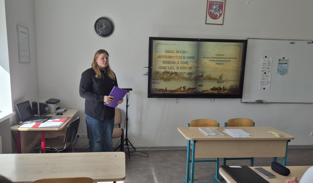 Dalyvavau 58-ojo jaunųjų filologų konkurso respublikiniame etape, kuris vyko Molėtų gimnazijoje. Pirmiausia buvome pakviesti į iškilmingą atidarymą gimnazijos aktų salėje. Visus susirinkusius pasveikino gimnazijos direktorė ir vertinimo komisijos pirmininkas – literatūrologas, rašytojas, eseistas, kritikas Regimantas Tamošaitis. Jis pristatė visų konkurso sekcijų vertintojus: Vilniaus universiteto, Literatūros ir tautosakos instituto mokslininkus, žinomus rašytojus, vertėjus. Po iškilmingo atidarymo visi išsiskirstėme į savo sekcijas rimtam darbui. Aš dalyvavau tautosakos sekcijoje. Mūsų darbų vertintoja buvo LLTI bibliotekos mokslo darbuotoja, hum. m. daktarė Salomėja Bandoriūtė-Leikienė. Šių metų mano darbo tema buvo „Zarasų rajono miestų, miestelių ir kaimų heraldikos kilmė, simbolika, jų ryšys su vietovardžiais, tautosaka“. Tyrimo tikslas – išsiaiškinti, ar herbai atspindi vietovės pavadinimo kilmę, kokią prasmę turi juose esantys simboliai, kaip jie siejasi su vietos kultūra bei gyventojų savivoka. Darbo tema gimė besisvečiuojant Senadvaryje (Zarasų r.), Fausto Kiršos tėviškėje, sodyboje, kuri dabar priklauso Arvydui Stanislavui Každailiui ir Reginai Irenai Každailienei. Pokalbio su Lietuvoje pramintu „heraldikos tėvu“, dailininku Arvydu Každailiu ir jo žmona Regina Každailiene, žinoma tekstilininke, metu iškilo klausimas: ar Zarasų rajono miestų, miestelių, kaimų herbai susiję su legendomis, istorija ir vietos bendruomenės savivoka? Šis pokalbis paskatino patyrinėti gimtojo krašto herbų sąsajas su vietos pasakojimais, istoriniais faktais ir tautosaka. Atlikusi tyrimą supratau, jog heraldika vis dar yra svarbi žmonių identiteto dalis, kuri sieja vietos bendruomenę, gyvenvietės istoriją, kultūrą bei tautosaką. Heraldika ne užmirštas praeities reiškinys, o gyvuojanti kultūros dalis.