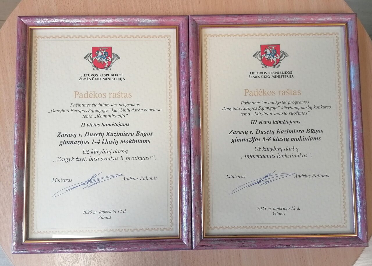Visi programoje ir konkurse dalyvavę mokiniai buvo apdovanoti atminimo dovanėlėmis bei LR žemės ūkio ministro padėkos raštais. Džiugu, kad pažintinės žuvininkystės programos „Išauginta Europos Sąjungoje“ įvairios veiklos ir kūrybinių darbų konkursas padėjo mokiniams geriau suprasti žuvininkystės svarbą, vietinių produktų vertę bei sveikos mitybos naudą.