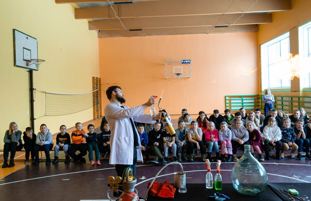 Be eksperimentų su ugnimi, stebėjome ir kitas reakcijas: spalvų pokyčius, burbuliavimą, dūmų susidarymą bei staigius medžiagų pasikeitimus, supratome, jog dujos gali reaguoti visiškai kitaip, negu galvojome. Vieno bandymo metu iš indo ėmė kilti dūmai, o kito – susidarė daug putų. Kiekvienas eksperimentas buvo lydimas paaiškinimų, todėl galėjome ne tik stebėti, bet ir suprasti, kas ir kodėl vyksta. Salėje netrūko ir bebaimių mokinių, kurie pasižymėjo drąsa ir sutiko būti eksperimentų dalimi.