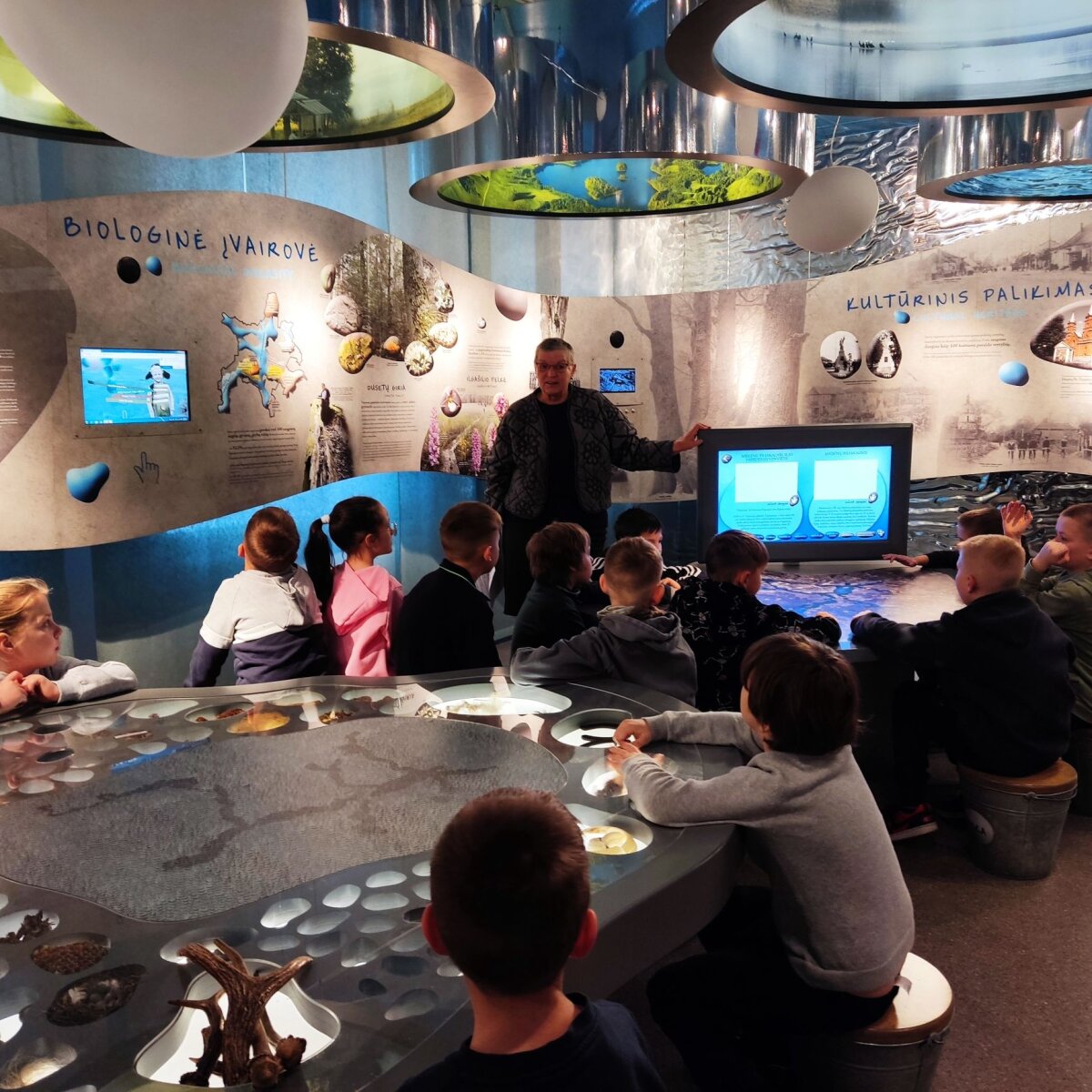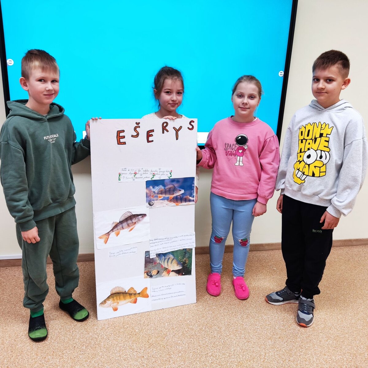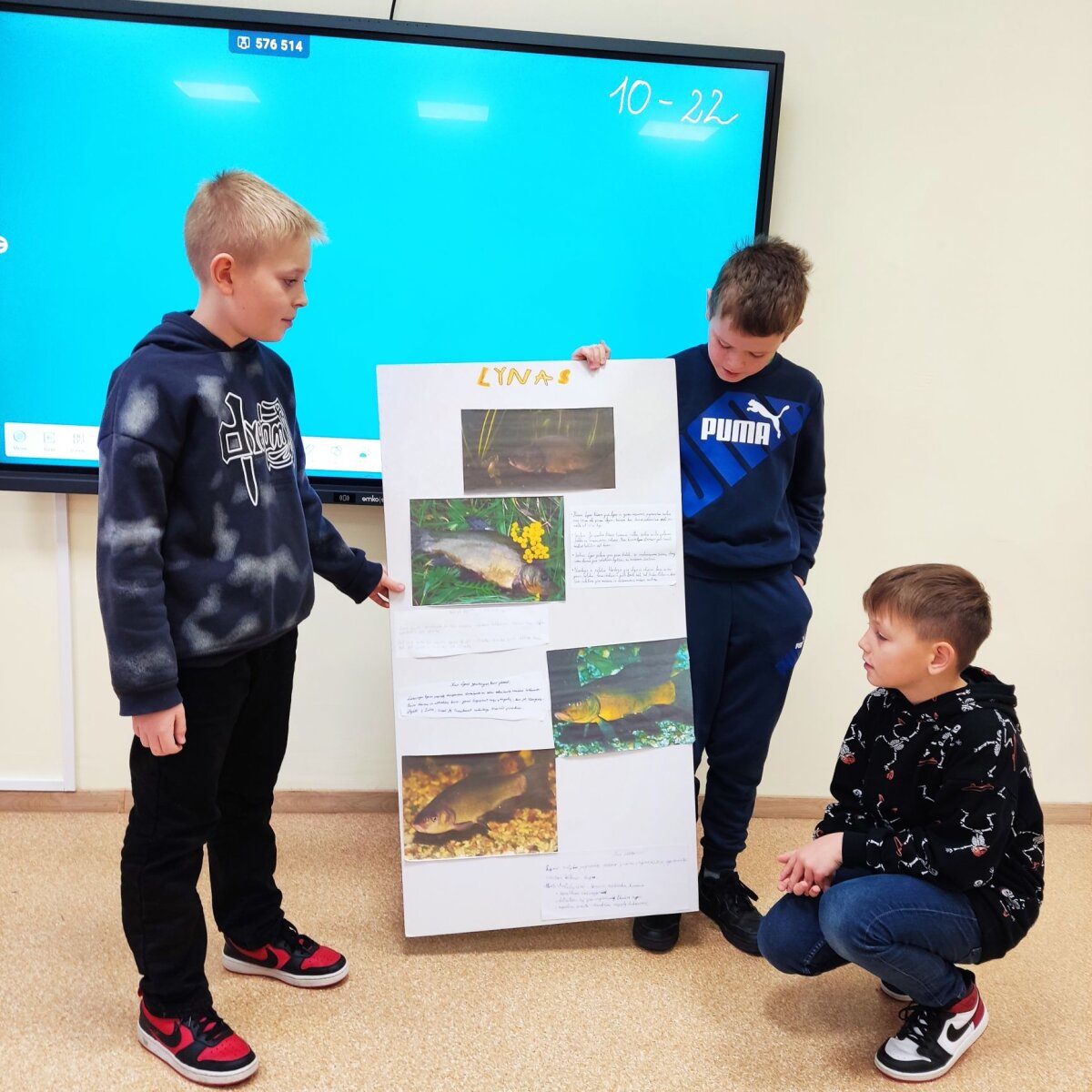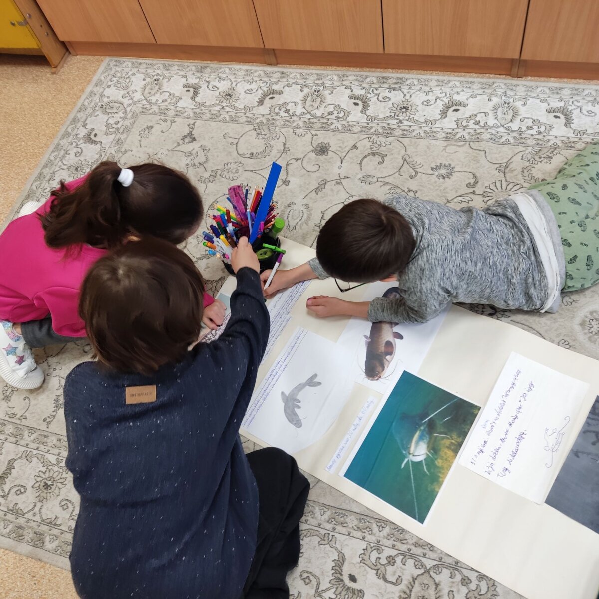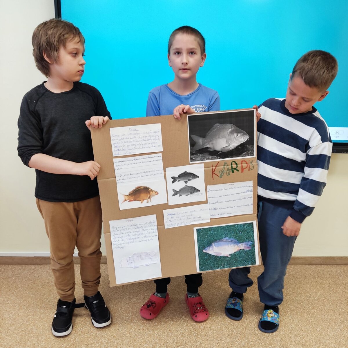Laboratorijoje su mikroskopu tyrinėjo skirtingų žuvų žvynus. Su lupomis apžiūrėjo žuvų plaukmenis, odą. Palygino, darė išvadas. Išnagrinėję žuvų sandarą, iš baliono ir antrinių žaliavų ketvirtokai gamino karpio ir upėtakio modelius, matavo jų ilgį, aukštį, sudarė sukurtų žuvų modelių duomenų lentelę ir diagramą. Trečiokai, pasiskirstę į grupes po 3-4 mokinius, sukūrė ir pristatė plakatus apie karpį, lyną, šamą ir ešerį, pasigamino „plaukiančios“ žuvies modelį. Naudojantis chronometru, apskaičiavo žuvies ,,nuplauktą“ kelią per pasirinktą laiką. 3-iokai ir 4-okai Sartų regioninio parko lankytojų centre apžiūrėjo stendus, sužinojo, kokios žuvys gyvena Sartų ežere, minė mįsles apie žuvis, sprendė kryžiažodį.