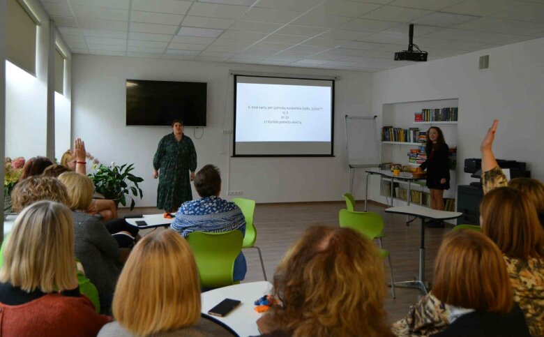 Po edukacijos mokytojai buvo pakviesti į gimnazijos skaityklą, kur vyko trumpas koncertas. Čia jų laukė juokingas, šmaikštus filmukus apie mokytojus bei viktorina. Teisingai atsakę į klausimus, buvo pamaloninti saldainiais. Šventinę nuotaiką kūrė skambančios dainos. Jas atliko Austėja Dimitrijeva, Uršulė Krikščionaitytė, Brigita Krastinaitė ir Augustė Mažeikaitė. Šventinį renginį vedė Lina Abramavičiūtė.