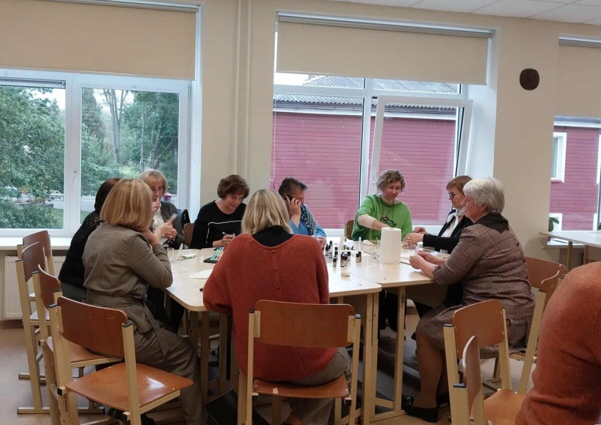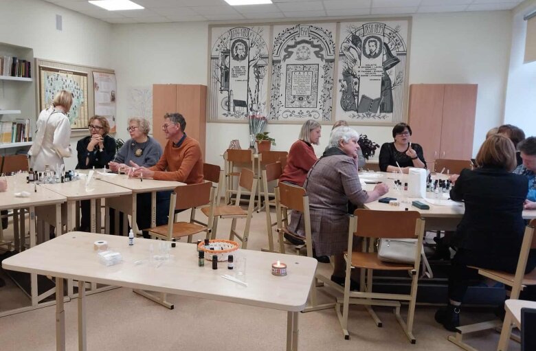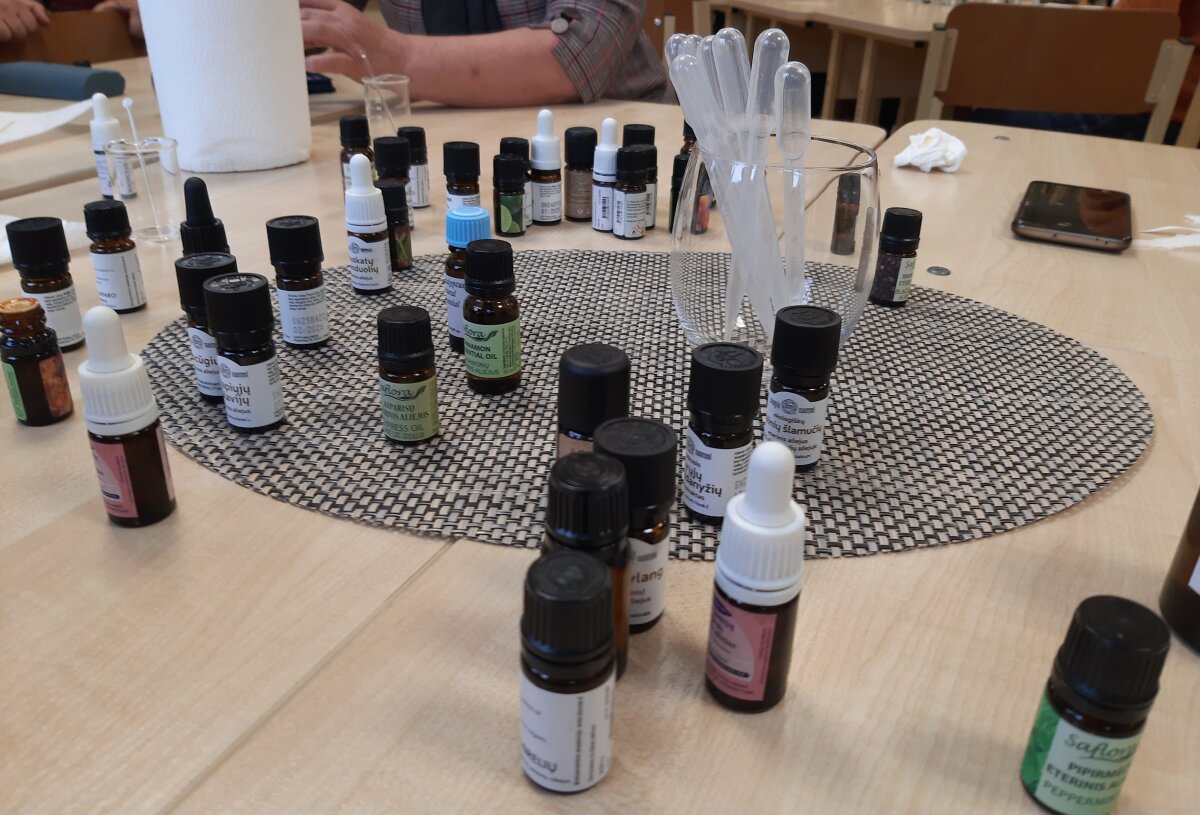 Vėliau mokytojai buvo pakviesti į Kvepalų edukaciją, kurią vedė buvusi mūsų mokinė Miglė Gaižiūtė. Vyko nuostabus užsiėmimas, kuris leido mėgautis įvairiais aromatais, stebėti, kaip jie sąveikauja tarpusavyje. Labai smagiai mokytojai pasinėrė į kūrybos gelmes bei naujus potyrius. Visi mokytojai pasigamino sau kvepalų.